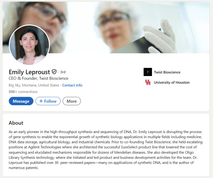 Twist Bioscience 首席执行官兼联合创始人艾米丽·莱普鲁斯特是高通量 DNA 合成与测序领域的早期先驱。她在创立 Twist Bioscience 之前,已在安捷伦科技(Agilent Technologies)领导开发了多项关键技术,拥有有机化学博士学位、数十项专利和众多同行评议的出版物。
